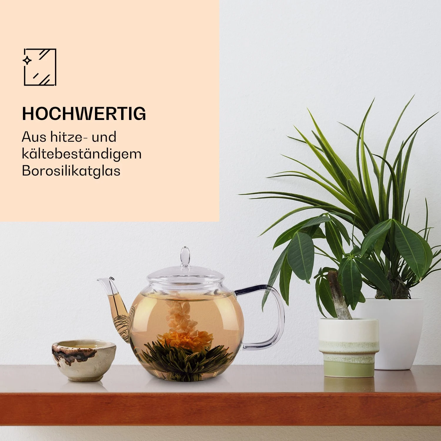 - exklusive Glaskanne mit Deckel, Edelstahl-Teesieb & Teeblumen