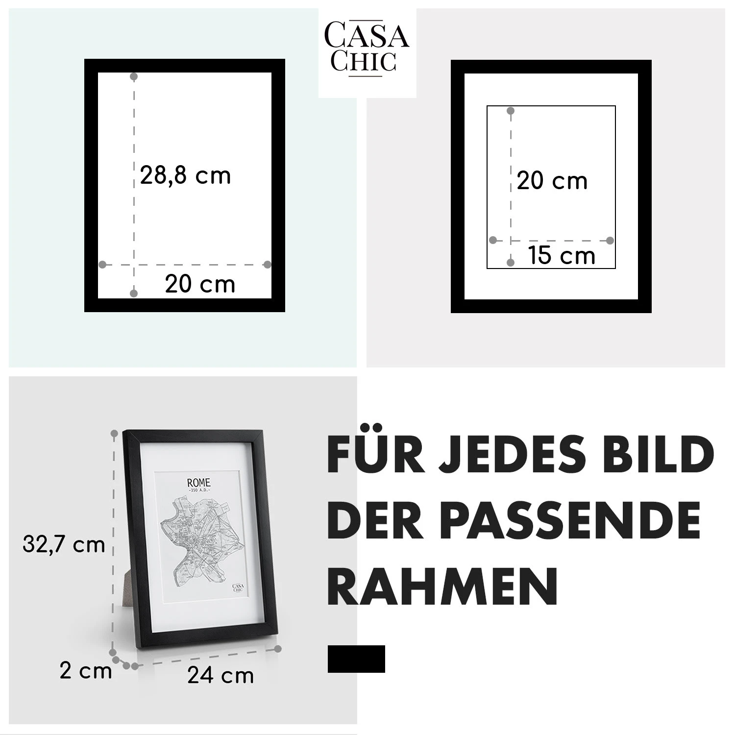Der exklusive Bilderrahmen Brighton von Casa Chic by blumfeldt gibt jedem Bild den perfekten Rahmen. Hier verbindet sich hochwertige Qualität aus Handarbeit mit besonders stilvollem Design. Hinter echtem Glas finden Kunstobjekte, Drucke oder Fotografien optimalen Schutz vor Staub, Feuchtigkeit und Licht. Die Tiefe des Brighton Bilderrahmens hebt dabei deine Bilder in jedem Raum wundervoll hervor und das breite Rahmenprofil wird zum eleganten Kontrast. Den hochwertigen Fotorahmen kannst du sowohl im Quer- als auch im Hochformat nutzen und ist an der Rückseite mit einem Aufsteller und einer Aufhängung versehen. Ohne Passepartout ist er passend für das Bildformat DIN A4 (21 x 29,7 cm), daher wundervoll für Zeugnisse oder Zertifikate geeignet. Hinter dem dazugehörigen Passepartout kannst du Fotos und Bilder mit einem Format von 15 x 20 cm kunstvoll präsentieren.