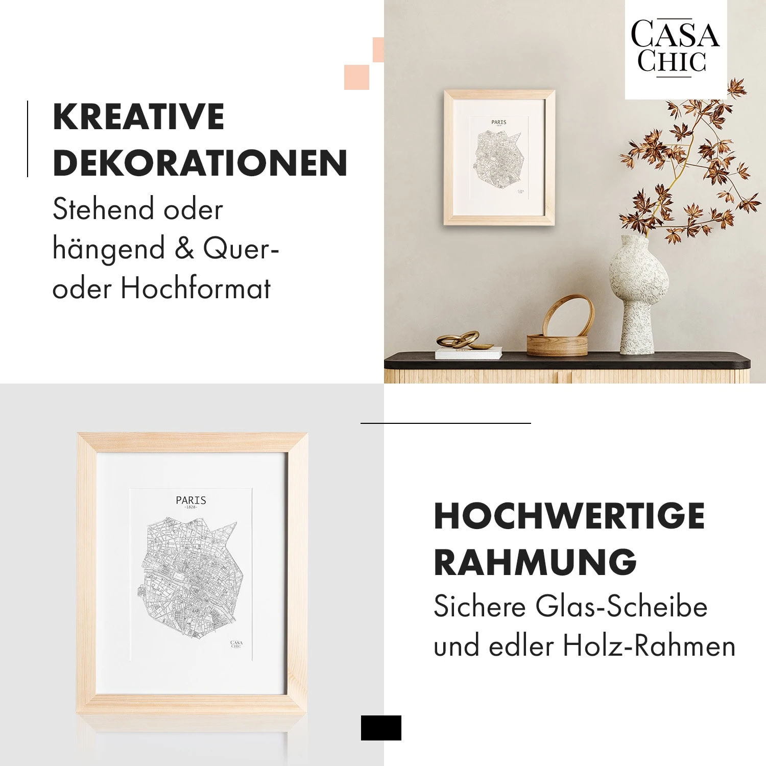 Mit dem schlichten Edinburgh Echtholz-Bilderrahmen von Casa Chic by blumfeldt kommen deine Fotos und Bilder sowohl im Hoch- als auch im Querformat ideal zur Geltung. Gestalte wunderschöne Wandcollagen oder arrangiere deine Lieblingsfotos auf dem Sideboard oder im Regal. Mit den Edinburgh Rahmen bist du flexibel. Das mitgelieferte Passepartout überlässt dir die Wahl des passenden Bildausschnitts. Sein breites Rahmenprofil schenkt einen edlen Kontrast und die Frontscheibe aus Echtglas schützt vor Staub und Schmutz.
