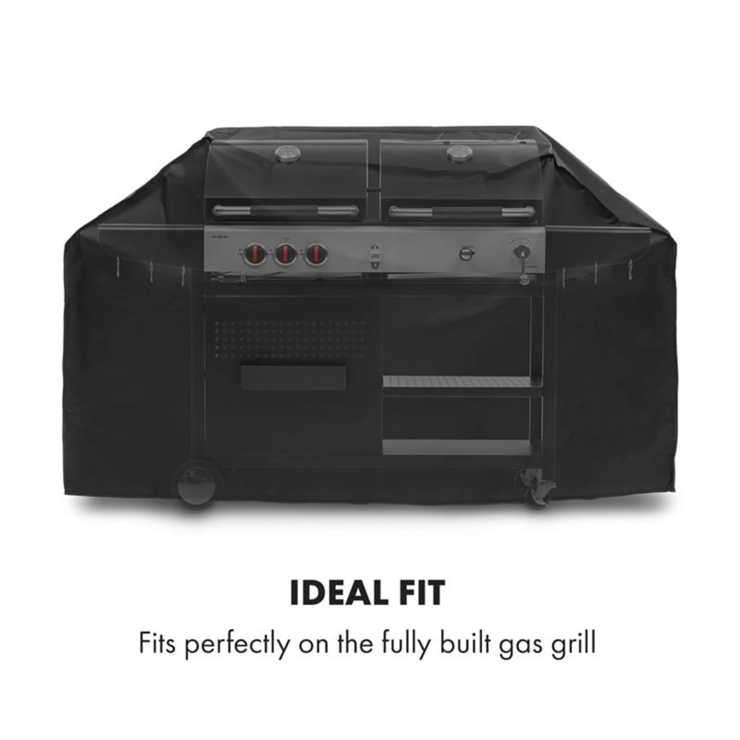 Der Klarstein Hot & Hot Wetterschutz passt perfekt auf den gleichnamigen Grill. Einfach überziehen und fertig – beschwerliches und zeitraubendes Umräumen und Einlagern entfallen in Zukunft komplett. Das Regen-Cover passt natürlich auch auf andere 3-Brenner-Gasgrills! Die extrem robuste Schutzhülle ist dabei aus extra schwerem 600D Canvas-Tuch gefertigt. Das ist nicht nur wasser- und reißfest, sondern dank der Materialmischung aus 30% Polyester und 70% PVC ganz einfach abwischbar. So kann der Grill in Zukunft direkt an seinem Einsatzort stehen bleiben, ist vor Wind und Wetter geschützt und mit nur wenigen Handgriffen direkt einsatzbereit.