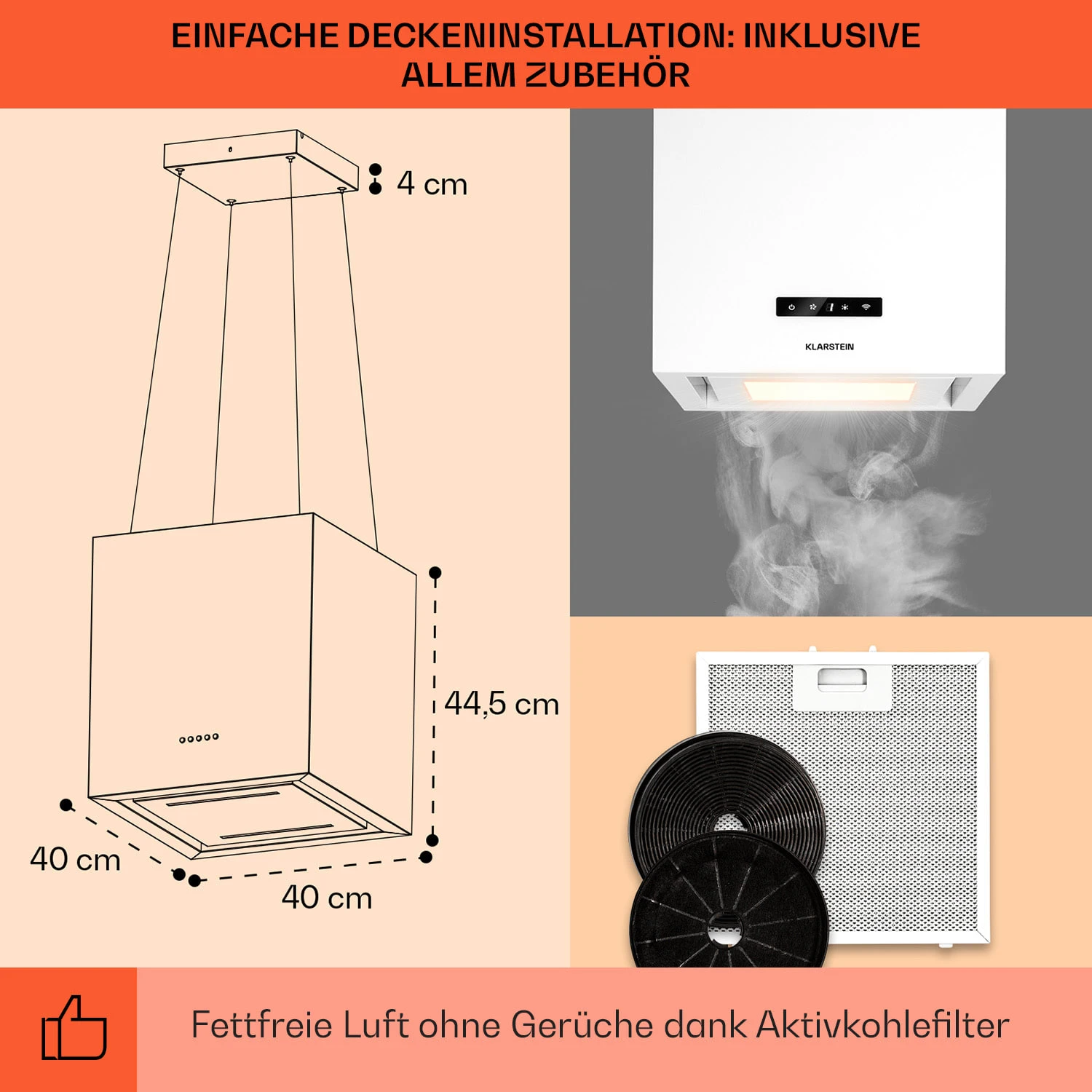 Beim Kornleuchter Smart von Klarstein ist der Name auch Programm: Die smarte Inselabzugshaube sorgt mit einem Luftdurchsatz von bis zu 595 m³/h für saubere und klare Luft in der Küche. Das integrierte 6500 Kelvin starke LED-Panel leuchtet dein Kochgeschehen taghell aus. Die Steuerung erfolgt ganz bequem via Klarstein App. Hochwertige Materialien und das kubische Design vereinen sich zu einem echten Blickfang. Mit drei Leistungsstufen, einem niedrigen Betriebsgeräusch von 67 dB und Energieeffizienzklasse A überzeugt der Klarstein Kronleuchter Smart vollends.