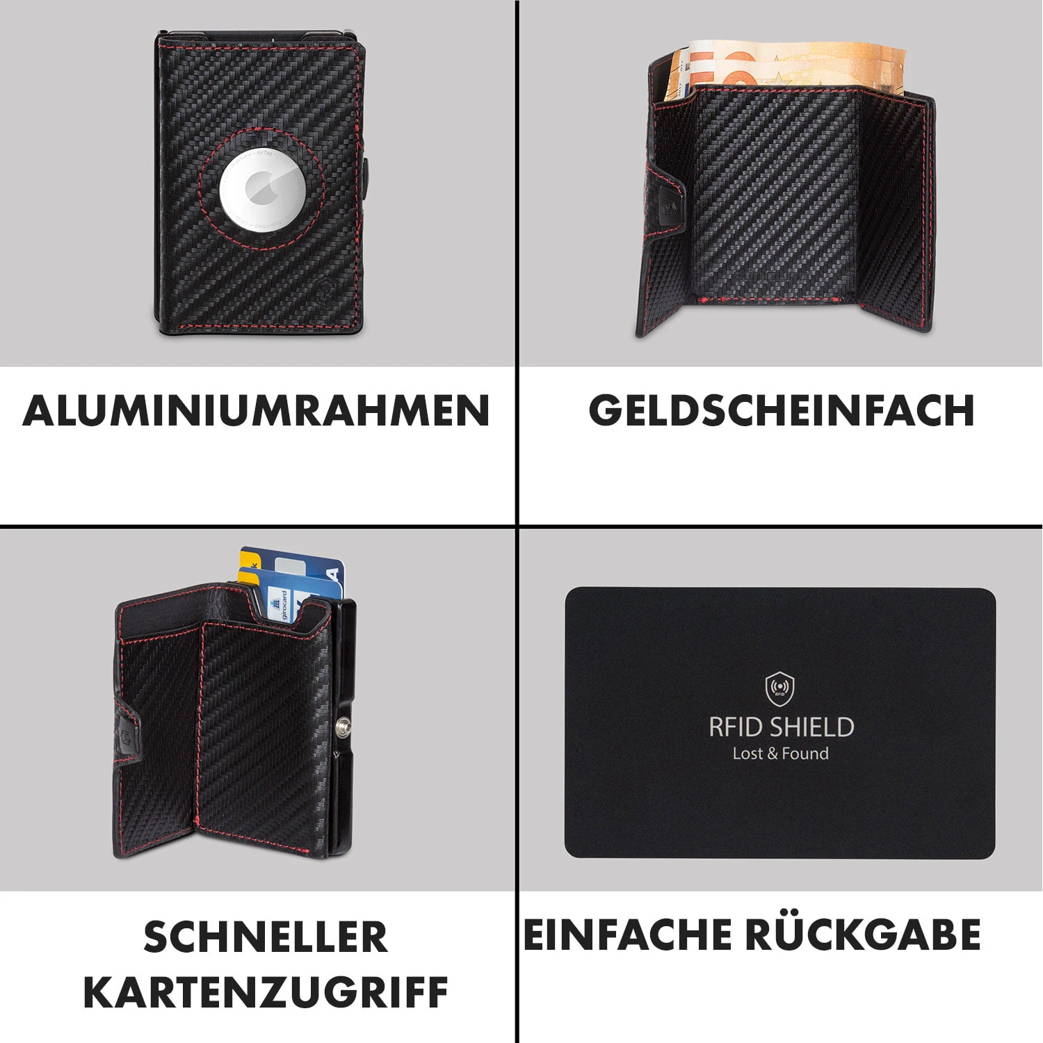 - 360° RFID-Schutz durch den Aluminium-Rahmen und zusätzliche RFID-Shield Karte